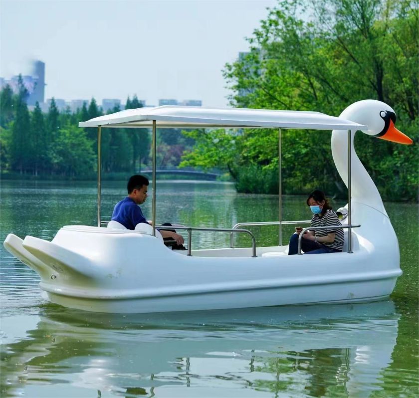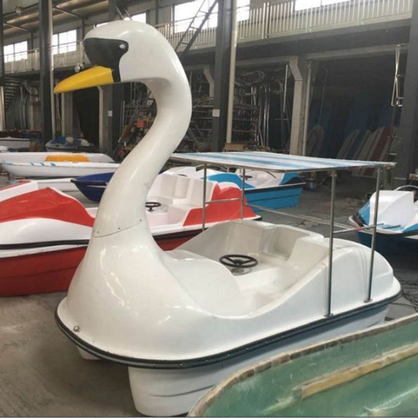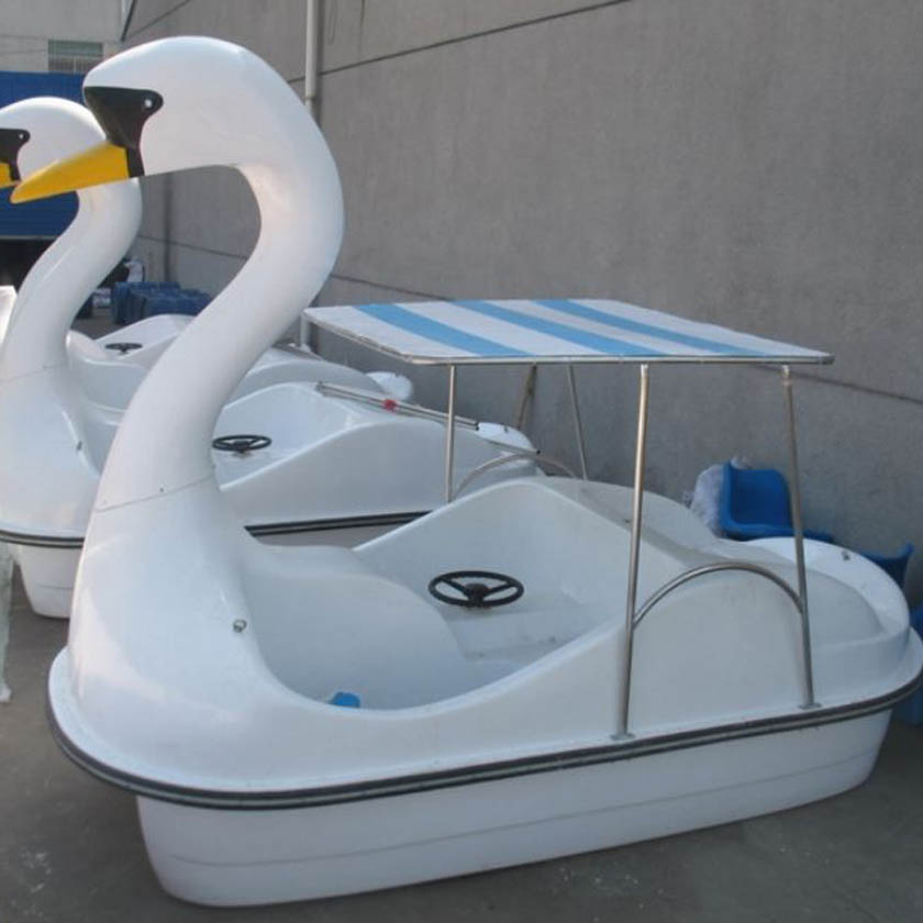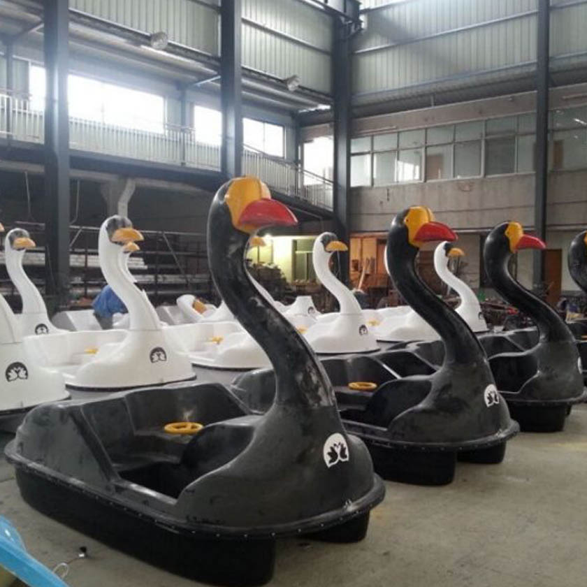 Les pédalos en fibre de verre ont une coque creuse. La coque est généralement légère et peut flotter sur l'eau. Les premiers bateaux étaient généralement en bois. Il y avait des roues avec des planches à pagaie des deux côtés ou à l'arrière du bateau. Les roues étaient actionnées par la force humaine. Tournez. La pagaie déplace l'eau vers l'arrière pour faire avancer le bateau.